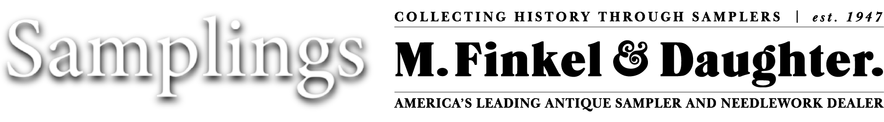 The sampler is signed and dated, “Amelia Powell Oct 9th 1829,” inside a cartouche with delightful animals nearby – a fat rabbit and bird, many little birds, deer and a very skinny animal that’s hard to identify. Stitched along the top, outside of the border, is the advice, “Pray without ceasing,” which we have seen on other English samplers.