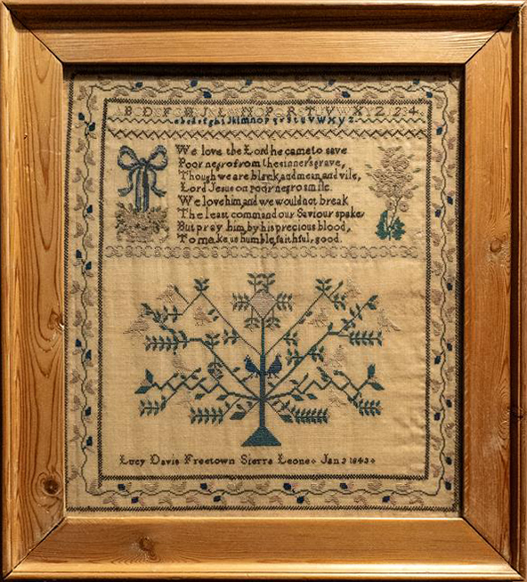 On January 3, 1843, Lucy Davis, a Black African girl, completed this sampler at a Church Missionary Society (CMS) school in Freetown, Sierra Leone. Her needlework features a central field divided by a cross-stitched border of repeating X motifs. The upper half contains a verse from Hymn for a Poor Negro, a poem printed in The Missionary Repository for Youth, and Sunday School Missionary Magazine.1 Missionaries across the expanding British Empire used literature like this to Christianize and anglicize African youth and reinforce British colonial hierarchies of race and class: