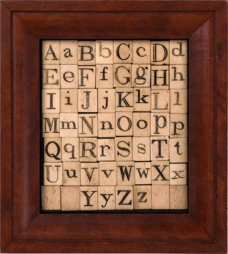 Little alphabet tiles made of bone were produced in the 19th century as teaching tools for children. This set, with both uppercase and lowercase letters, is now framed and we enjoy the obvious graphic relationship that it has to samplers. The mahogany frame is 19th century as well.