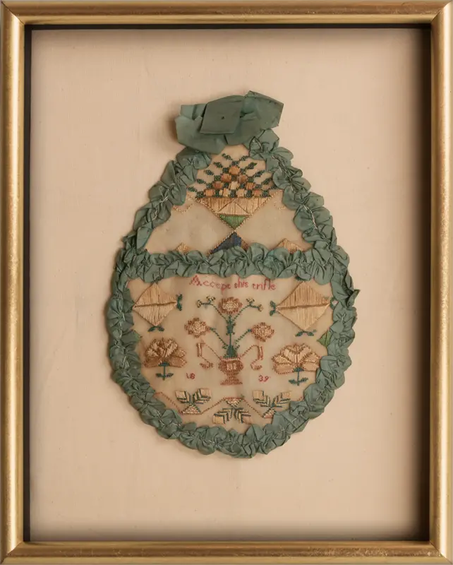 Various forms were made and they are generally not signed or dated. This is a wall pocket which, remarkably, retains its original teal-blue silk ribbon edging. We see very few of these and the fact that this one is dated renders it even more unusual than others.