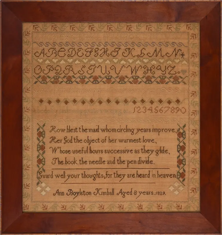 Many praiseworthy samplers were made in the Essex County towns of Newbury and Newburyport in the 18th and early 19th century, and specific shared characteristics have emerged. One of these is the excellent verse that Ann Boylston Kimball stitched onto her fine sampler; it notes that the hours spent with book, needle and pen are a blessing. Ann was only 8 years old but she was obviously already an accomplished needleworker.