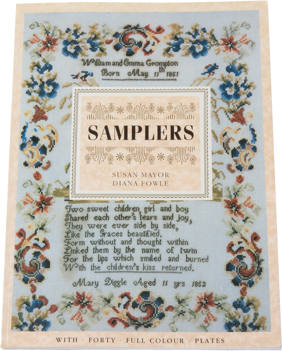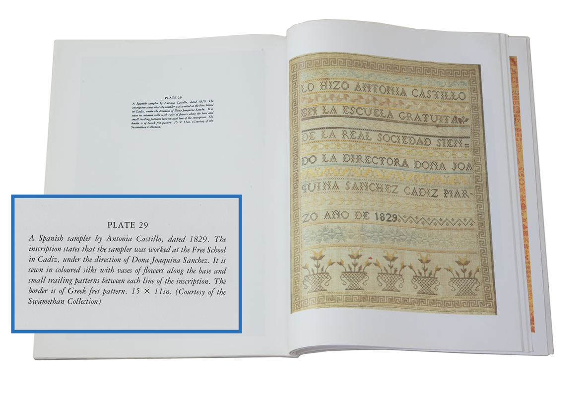 Fine sampler made at the Free School of The Royal Society under the direction of Mrs. Joaquina Sanchez, Cadiz, March 1829. A large format book, Samplers, by Susan Mayor & Diana Fowle, features this sampler as figure 29. A copy of this book, seen below, accompanies the sampler.