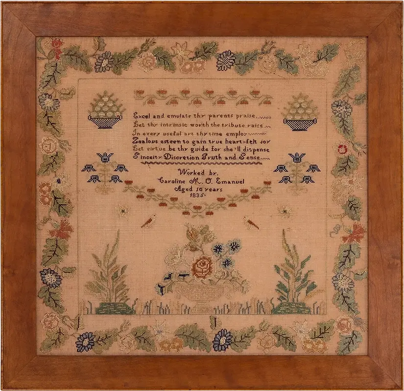 Caroline’s sampler presents a central floral arrangement flanked by leafy plants growing from hillocks. The verse is one that we haven’t seen previously; it epitomizes the advice given to schoolgirls of the period, ending with, “Let virtue be thy guide for she’ll dispense / Sinceity [sic] Discretion Truth and Sense.” The excellent, four-sided border is highly developed, with large veined leaves and flower blossoms.