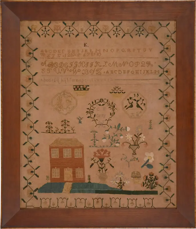 This splendid, large sampler is greatly appealing for its aesthetic appeal as well as the technical skills of its maker. She signed her sampler, in the center cartouche, “C E Gray” - and we know that she was Catherine Elizabeth Gray of Charles County, Maryland. Much is known about the family, a prominent one in this area in the south central part of the state.