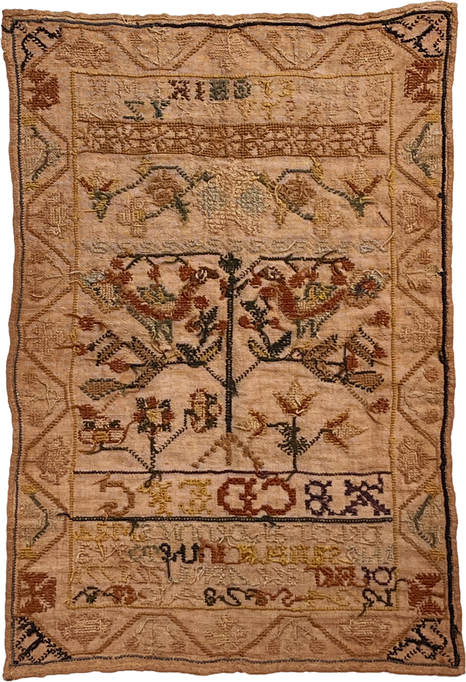 Signed, “Deborah Dennis Mad / e This Sampler In The 10 Yea / Of Her Age April 22 1771,” this sampler is part of a highly regarded group made in Norwich, north of New London, Connecticut. These samplers were made as early as the 1760s and shared characteristics can be found occasionally on samplers made into the early decades of the 19th century. Clearly a number of different teachers continued this tradition and these motifs.