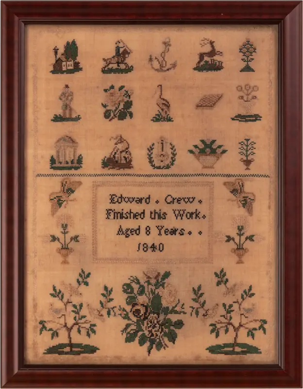 Samplers made by boys are as rare as hens’ teeth (should we say roosters’ teeth?) and we are very pleased to offer this very good example. Edward Crew, age 8, carefully stitched many delightful little pictorial images on the top half of his sampler; these may have held special significance to him.