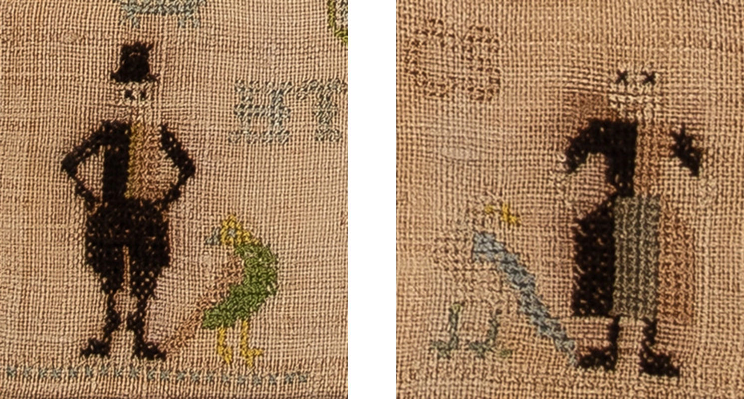 Of great interest on Elisabeth’s sampler are the two little figures in the lower corners. They are depicted in the precise uniforms that were unique to the girls and boys of the Burgerweeshuis Orphanage and had been worn by them for centuries.