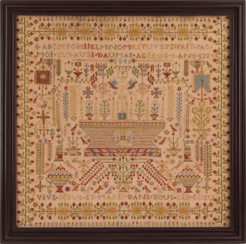 (it seems the final R didn’t fit) which translates to, “Made by me Eudauxi Daumas age 8 years / 1845 / Long live Jesus and Mary in all hearts.”