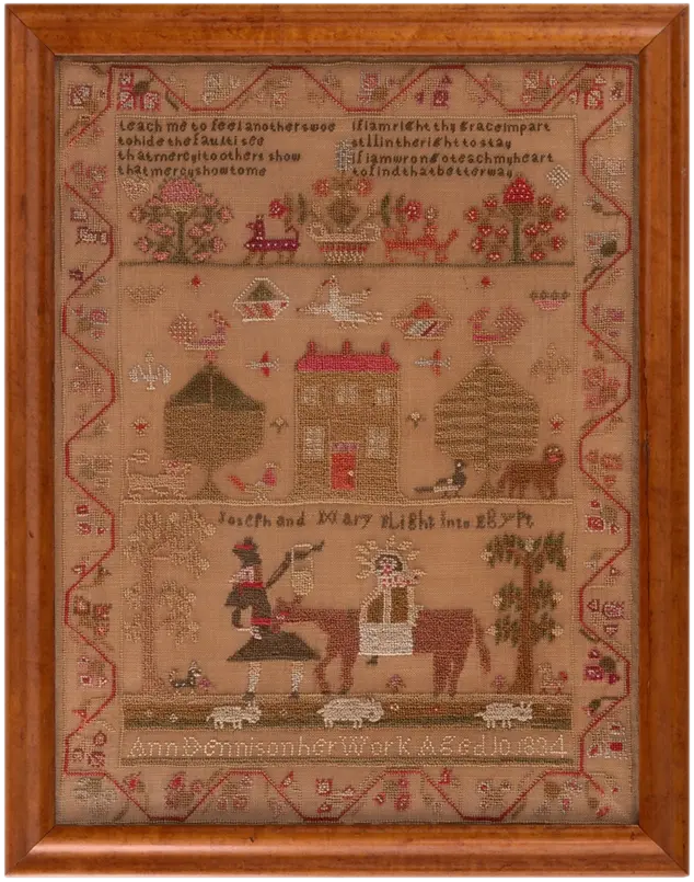 Three fat sheep populate the lawn below and the scene above is that of a classic house flanked by trees. The deep pink roof and front door along with wonderful fat trees topped by birds and the many animals all add to the appeal of the sampler.