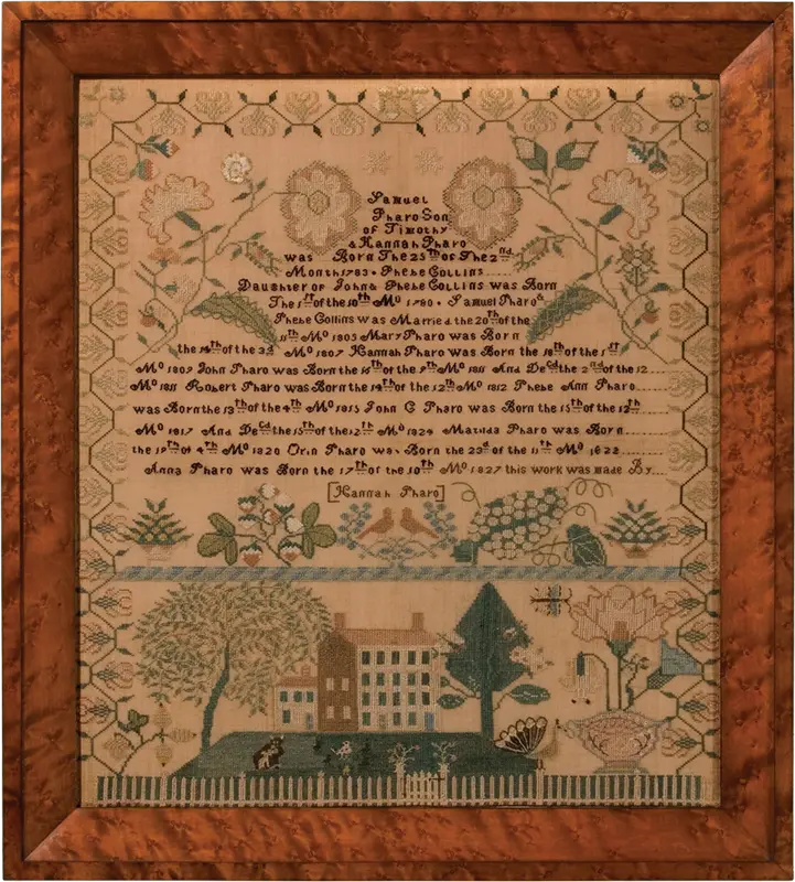 While large, fully-developed family record samplers were frequently made in New England, few were made in the Mid-Atlantic states. Even less commonly found are family record samplers documenting Quaker families, however this is precisely that: an elaborate, pictorial family record sampler with a wonderful house and lawn scene, listing the vital information of the family of Samuel and Phebe (Collins) Pharo.