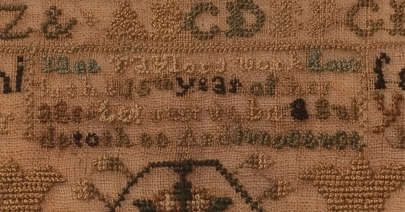 This sampler is signed (see detail below) inside the small box just above the fine horizontal tulip and flower band, “Jane Taylor’s work done / in the 15th year of her / age” and the band above that reads, “the names of the seven children of John Taylor / & Elizabeth his wife. Mary Eliza John / Ann Jane Sarah & David Taylor 1794.”