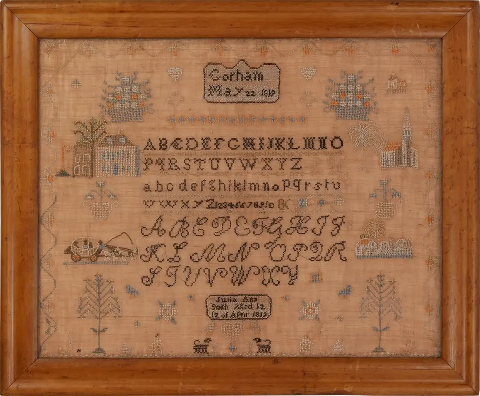 Julia Ann Smith was 12 years old and living in Gorham, a town about 60 miles west and south of Syracuse, New York, when she made this delightful sampler in 1819.