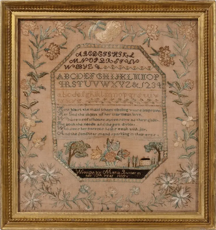 The sampler we offer now was made by Maria Butler in 1809; it was published in American Antiques from Israel Sack Collection, Vol. V (Highland Hose Publishers, 1974). It was the only sampler in this book and the Israel Sack provenance adds to its significance. Maria included a little house in the background of her pictorial scene, a charming addition not found on the other Leominster samplers. Notably, this sampler remains in its fine original gold leaf frame.
