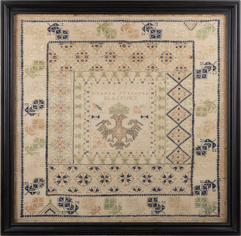 Excellent sampler with the “Hapsburg eagle” as a central motif, made by Maria Juliana Blazquez in the late 18th century. This sampler, along with 11 others, is discussed in a recent essay, Samplers from Spain: An Introduction by Dr. Lynne Anderson, Founder and Director of the Sampler Consortium and Director of the Sampler Archive Project, which can be read here.