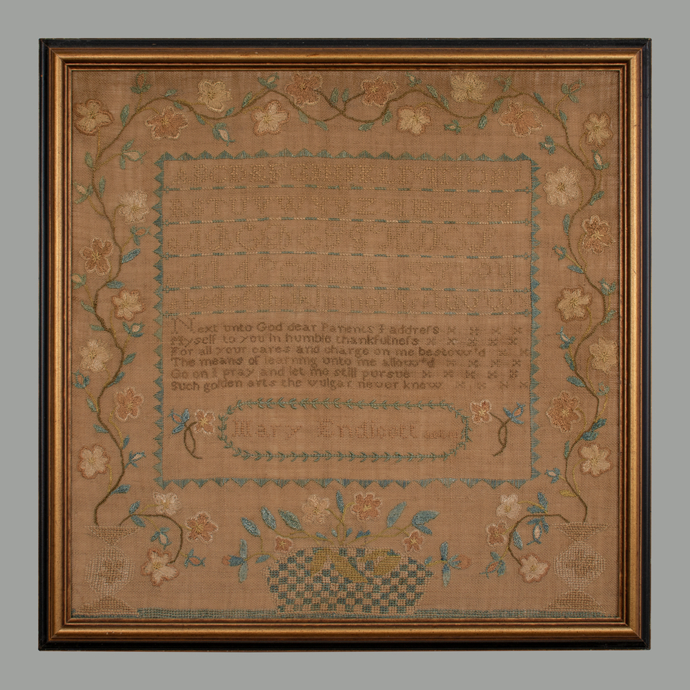 The provenance of this sampler is highly significant as it was in the personal collection of the late Susan B. Swan, the revered, long-time Curator of Textiles at Winterthur Museum. The sampler remained in the collection of one of her sons and is now available for sale. A letter from the Swan family accompanies the sampler.
