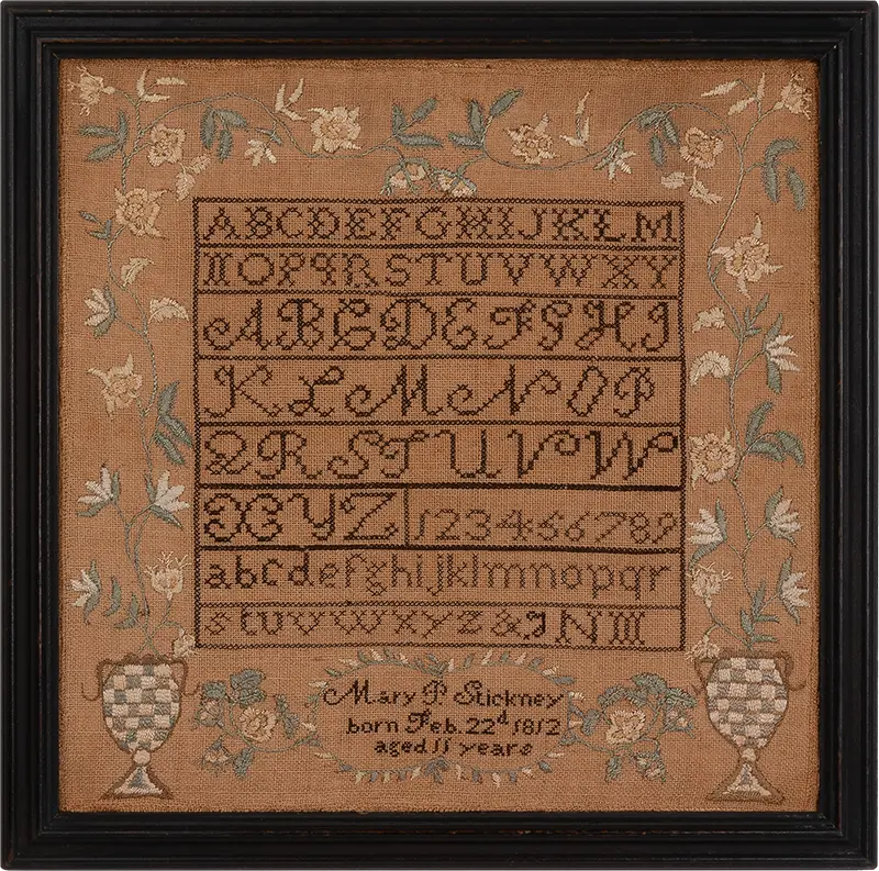 A fine, small sampler, this is signed, “Mary P. Stickney born Feb. 22d 1812 aged 11 years.” Mary Palmer Stickney was the third child of seven born to Ebenezer and Hannah (Fitz) Stickney of Londonderry, south of Manchester, New Hampshire. The roots of both the Stickney and Fitz families extend back to the 1630s in New England and photocopies of the published genealogies are included in the file that accompanies the sampler.