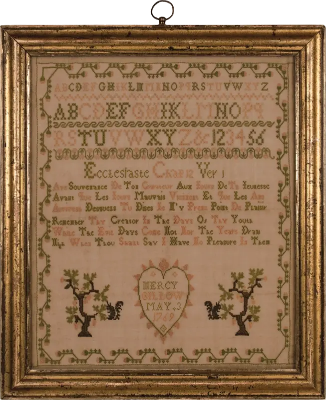 The sampler features a biblical verse in both French and English and is sophisticated as well as charming. Mercy surrounded her inscription with an unusual sawtooth heart flanked by squirrels and oak tree, all skillfully accomplished. The palette of predominantly light green and pale pink is one rarely found on samplers.