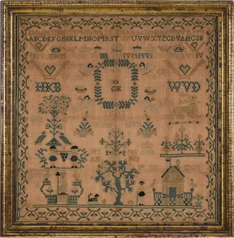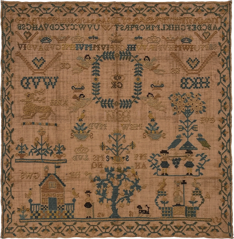 The motifs include the Spies of Canaan (Joshua and Caleb holding a large bunch of grapes), the Free Maiden (a lady standing atop a gate symbolizing Liberty), an apple tree with a delightful man, his dog and the year, 1802, flanking the trunk, a wonderful house with large birds sitting on the fence posts, a recumbent deer, and many other classic elements. The center wreath is held by four fine heralding angels and the use of the eyelet stitch in various letters and motifs is notable.