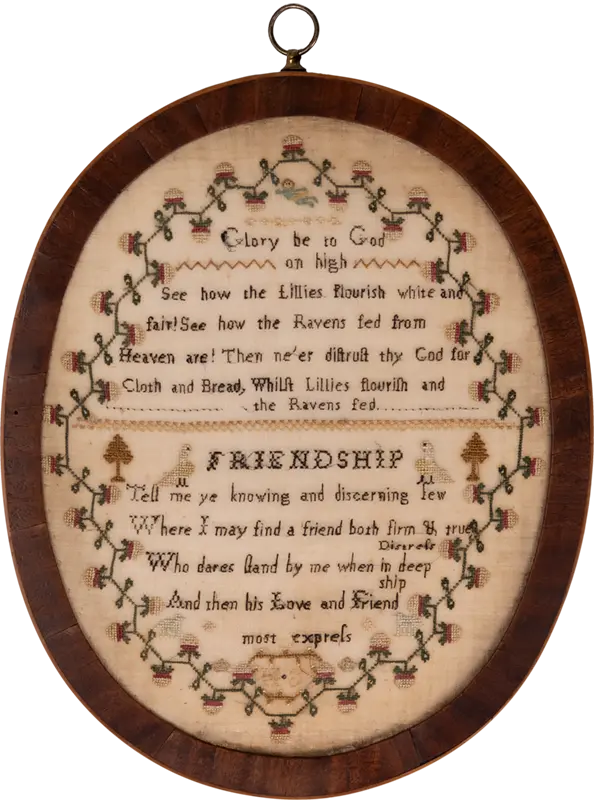 We very occasionally find samplers worked in an oval format and these are wonderful treasures. The composition is always highly refined and reflects the oval structure, and we generally find the needlework to be very delicate. Adding to the many attributes of this particular oval sampler is the fact that it remains in its very fine, original inlay frame.