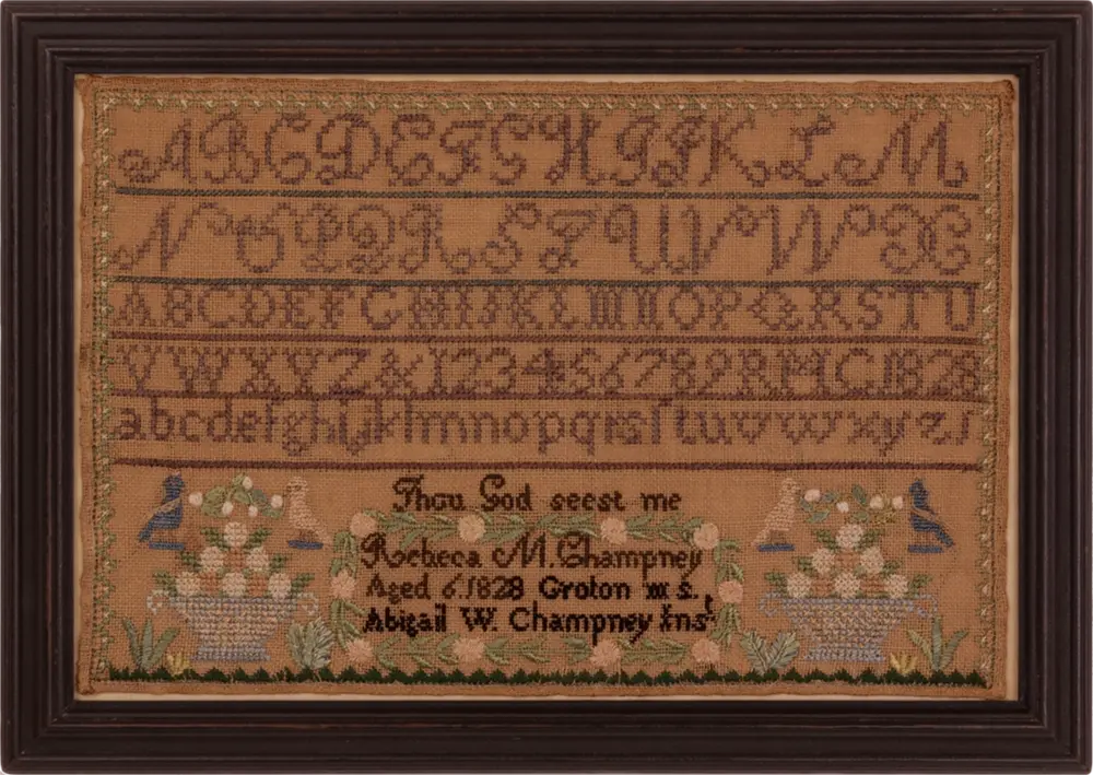 We love a sampler that tells the story of family ties. Rebecca Miller Champney, age 6, stitched the name of her aunt and instructress, Abigail Walters Champney, as part of the inscription on her excellent sampler. Rebecca was born on August 6, 1822, to Francis and Rebecca (Miller) Champney of Groton, Massachusetts. Her father’s younger sister, Abigail Walters Champney (1796-1883) was her teacher, either in a school or a family setting.
