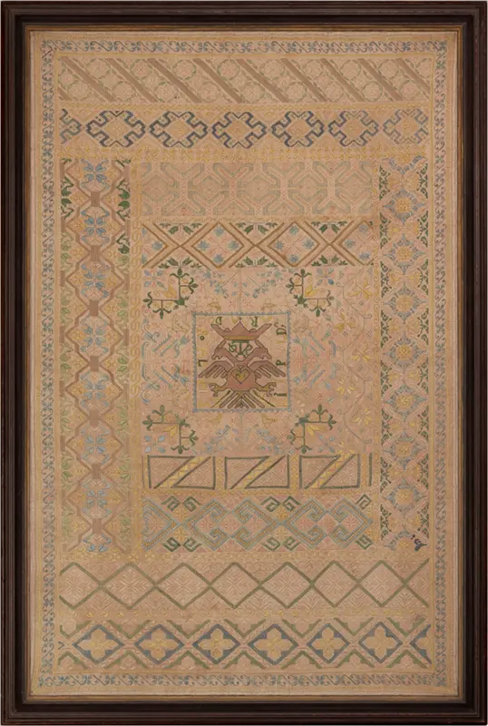 Important, large sampler by Rosa López, embroidered while a student of Doña Mara Aludo with Hapsburg eagle and many intricate bands. This sampler, along with 11 others, is discussed in a recent essay, Samplers from Spain: An Introduction by Dr. Lynne Anderson, Founder and Director of the Sampler Consortium and Director of the Sampler Archive Project, which can be read here.
