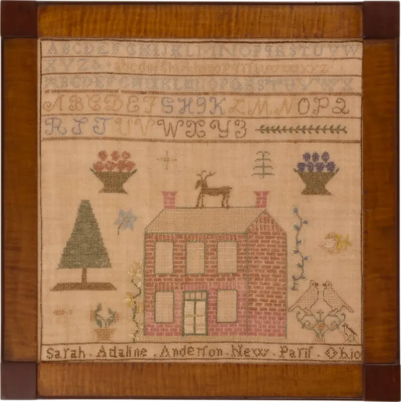 Sarah likely made her sampler when she was between 10 and 12 years old. The composition is ambitious, but the needlework might evidence a slightly less experienced hand. We particularly love the excellent brick house with a large stag on the roof. The pair of birds at lower right shows the influence of Quaker needlework design. Studebaker notes that the Quakers established a monthly meeting in Preble County in 1809.