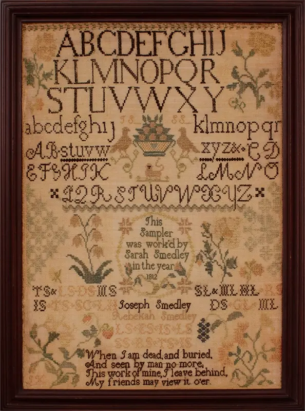 The daughter of Joseph and Rebekah (Lewis) Smedley, Sarah Smedley was born on August 31, 1792, in Willistown, Chester County, Pennsylvania. The excellent sampler that Sarah made in 1812 is strongly influenced by the Quaker sampler design that proliferated in southeastern Pennsylvania in the first decades of the 19th century. Along with the classic Quaker style strong, block letter alphabets, many beautifully worked Quaker motifs fill the entire composition: pairs of birds, fruit baskets, half medallions and many flower and berry sprigs and branches. Sarah signed her work in a handsome center cartouche punctuated with little stars. The sampler also includes family names and many family initials.