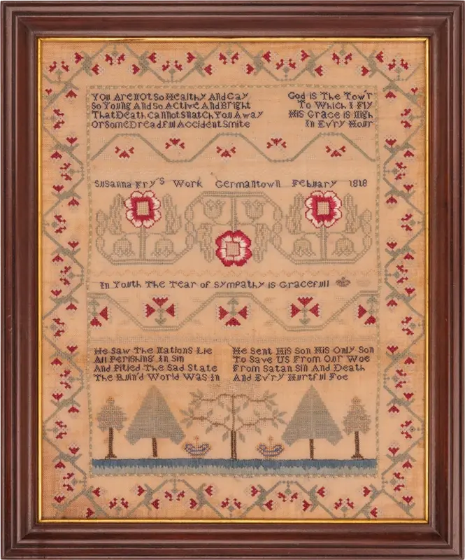 Signed, “Susannah Fry’s Work Germantown” this beautifully worked sampler exhibits the fine patterns and techniques employed by teachers and samplermakers in Philadelphia in the late 18th and very early 19th centuries.